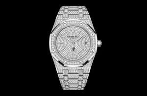 オーデマ・ピゲの「ロイヤル オーク ジャンボ エクストラシン」に属するこのモデルは、39mmのケース径と8.1mmの薄型ケースを採用。素材には18Kホワイトゴールドを使用し、ケース全体に贅沢なダイヤモンドが敷き詰められています。具体的には、ケースに約138石(約2.64カラット)、ダイヤルに約422石(1.63カラット)、ブレスレットに約968石(約4.02カラット)ものブリリアントカットダイヤモンドが使用され、まさに“ジュエリーウォッチ”の粋を極めた一本です。