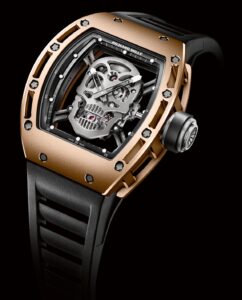 リシャール・ミルの「RM 052 トゥールビヨン スカル」は、ムーブメントの中心にスカル(頭蓋骨)をデザインしたユニークなモデルです。このスカルはチタン製で、上下の顎が可動のブリッジとして機能するなど、デザインと機能を融合させた革新的な作品となっています。