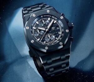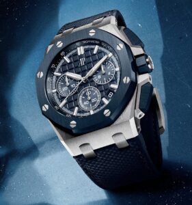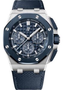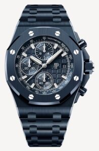 2025年に発表されたロイヤル オーク オフショア クロノグラフ 26238CD.OO.1300CD.01は、オーデマ ピゲの伝統的な「Bleu Nuit, Nuage 50」カラーを全面的に採用したモデルです。ケース、ベゼル、プッシュボタン、リューズ、そしてブレスレットに至るまで、すべてがこの深いブルーのセラミックで統一されており、ブランドの革新的な素材使いと卓越したデザインセンスを象徴しています。