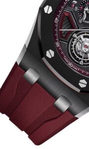 43mmのケースサイズは存在感があり、マルチファセットのデザインが特徴です。エッジ部分にはポリッシュ仕上げが施され、立体的な構造を強調しています。ストラップはインターチェンジャブル仕様で、ブラックとバーガンディのラバーストラップが付属し、チタン製のトリプルフォールディングバックルが装備されています。