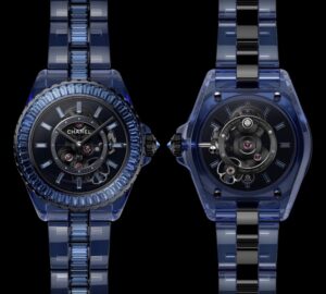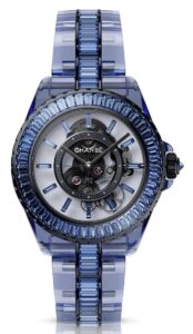 J12 BLEU X-RAYは、ケースとブレスレットにブルーのサファイアクリスタルを採用し、透明感と深みのある色彩を実現しています。さらに、ベゼルとリンクには196個のバゲットカット・ブルーサファイアがセットされ、ブラックコーティングが施されたホワイトゴールドが全体を引き締めています。