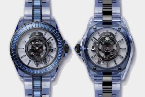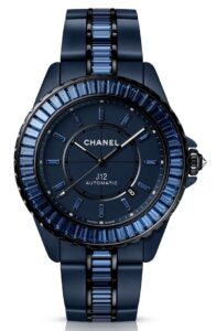 28mmのマットブルーセラミックケースに、同じくバゲットカット・ブルーサファイアをあしらったモデルで、高精度クォーツムーブメントを採用しています。