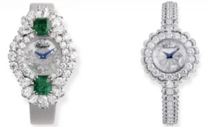 ショパールらしい「倫理的ホワイトゴールド」をベースに、両モデルとも繊細なダイヤモンドセッティングが施されています。文字盤にはホワイトマザーオブパールが用いられ、柔らかな光沢が優雅な印象を強めます。花を模したダイヤモンド装飾があしらわれ、自然のモチーフと繊細な技術の融合が感じられます。