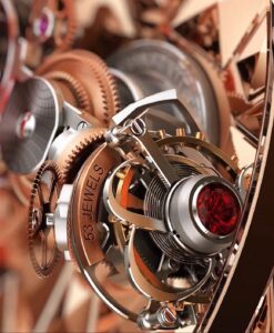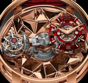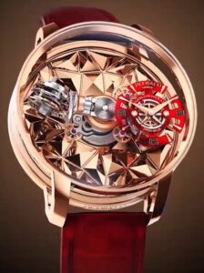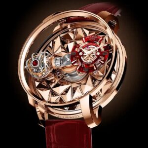 「アストロノミア レボリューション フォーアクシス トゥールビヨン」は、47mmの18Kローズゴールドケースに、ドーム型のサファイアクリスタルを組み合わせた壮麗なデザインが特徴です。ケースサイドにもサファイアウィンドウを配し、ムーブメントの動きを多角的に楽しめます。ダイヤルはスケルトン仕様で、赤いポリカーボネート製の時分表示ダイヤルが配され、常に正位置を保つ特許取得のディファレンシャルシステムにより、視認性も確保されています。ベースプレートには、鏡面仕上げのローズゴールド製ハニカム構造が施され、光の反射が美しい視覚効果を生み出します。