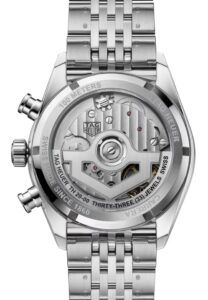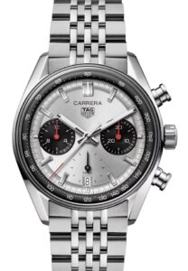 ケース径は39mmで、ステンレススティール製の「ビーズオブライス」ブレスレットが装着されています。このブレスレットは、1960年代のカレラモデルに採用されていたデザインを現代風にアレンジしたもので、快適な装着感と洗練された外観を兼ね備えています。