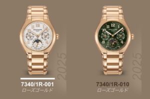 リファレンス7340/1R-001のシルバーダイヤルは、縦横のサテン仕上げが交差するシャンタンシルク風のテクスチャーが特徴です。一方、リファレンス7340/1R-010のオリーブグリーンダイヤルは、サンバースト仕上げにより光の反射で美しい輝きを見せます。どちらのモデルも、ローズゴールド製のアラビア数字とバトン型の針が採用され、視認性とエレガンスを両立しています。