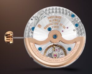 本モデルには、フレデリック・コンスタントが開発した34番目の自社製ムーブメント「FC-776」が搭載されています。この自動巻きムーブメントは、従来の「FC-775」をベースに改良され、パワーリザーブが72時間に延長されています。毎時28,800振動(4Hz)で、6姿勢での調整が施され、精度と信頼性が向上しています。ムーブメントの装飾には、ペルラージュ仕上げや円形のコート・ド・ジュネーブが施されており、サファイアクリスタルのケースバック越しにその美しさを堪能できます。
