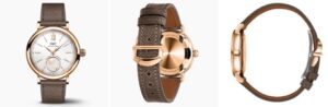 さらに、ストラップにはタウペカラーのカーフスキンを使用し、エレガントな雰囲気を強調。クイック交換機構を備えており、シーンに応じて別のストラップへ気軽に変更可能です。実用性とファッション性を両立した設計が魅力です。