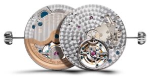 自社開発のキャリバーFC-980-4は、33石、28,800振動/時、約38時間のパワーリザーブを持ち、トゥールビヨン機構にはシリコン製の脱進機とアンクルを採用。美しさと性能を両立する、まさに芸術品と呼ぶにふさわしい仕上がりです。