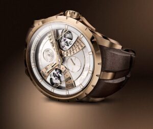 1995年に創業したロジェ・デュブイは、2025年に30周年を迎えました。この節目を記念して発表された「エクスカリバー モノバランシエ バイレトログラード カレンダー」は、創業者が好んだバイレトログラード表示を現代的に再解釈したモデルです。バイレトログラード表示は、針が半円状の目盛りを移動し、各サイクルの終わりにゼロに戻る機構で、1989年にロジェ・デュブイとジャン-マルク・ヴィダレッシュが共同特許を取得しました。1996年には、この機構を搭載した腕時計を発表しています。