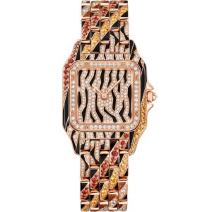 Ref. CRHPI01698は、カルティエの象徴であるパンテールを基に、シマウマとトラの要素を取り入れたユニークなデザインが特徴です。ブラックラッカーとゴールドブラウンラッカーで描かれた縞模様が、野生の美しさを表現しています。