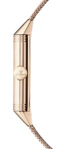 Ref. Q713216Jは、18Kピンクゴールド製のケースと同素材のミラネーゼリンクブレスレットを採用しています。文字盤はグレイン仕上げのゴールドカラーで、アールデコの美学を感じさせる植字インデックスとドーフィン針が特徴です。6時位置にはスモールセコンドを配置し、直線的なデザインに柔らかなアクセントを加えています。