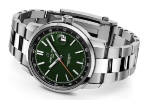 グリーンダイヤルのモデルは、自然の豊かさと落ち着きを表現しています。ステンレススチール製のブレスレットが付属し、シンプルながらも存在感のあるデザインです。グリーンのダイヤルは、個性的でありながらも上品な印象を与えます。