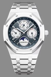 山田哲人選手は、トリプルスリーを複数回達成するなど、日本プロ野球界を代表する内野手です。彼が選んだ腕時計は、オーデマ・ピゲの「ロイヤル オーク パーペチュアルカレンダー ホワイトセラミック」。この時計は、ホワイトセラミック製のケースとブレスレットに、ブルーの「グランドタペストリー」模様の文字盤が組み合わされ、洗練された美しさを放っています。永久カレンダー機能を搭載し、ムーンフェイズ表示も備えており、複雑機構とデザイン性を兼ね備えた逸品です。山田選手の精密で華麗なプレースタイルに、この時計はぴったりの選択と言えるでしょう。