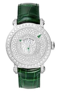 「トリプルミステリー」は、18Kローズゴールドまたはホワイトゴールドのケースに、ブリリアントカットまたはバゲットカットのダイヤモンドが施されています。ダイヤルには、232個のブリリアントカットダイヤモンドがセットされ、時間、分、秒を示す三つの回転ディスクが配置されています。各ディスクには、ダイヤモンド、エメラルド、ルビー、ブルーサファイアなどの三角形のインデックスが施され、対応するカラーのアリゲーターストラップと組み合わされています。