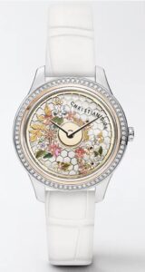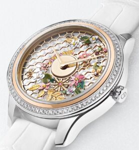ディオールの「グランバル(Grand Bal)」シリーズの新作として登場したRef. CD153B2X1703は、ダイヤル中央に回転式の装飾ローターを備え「ドレスを纏うような回転」を演出。フェザーやラグジュアリーなジュエルがあしらわれ、まるで舞踏会のようなフェミニンな装いが魅力です。これはシリーズの象徴的なディテールを継承しつつ、新素材や配色で進化を遂げた一品といえるでしょう。
