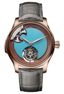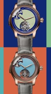 「エンデバー・ミニッツリピーター トゥールビヨン コンセプト ポップ Ref. 1904-0405」は、H.モーザーが2025年に発表した限定モデルで、同社の「ポップ」コレクションの一部として登場しました。このモデルは、ミニッツリピーターとフライングトゥールビヨンという二つの複雑機構を搭載し、ケース径40mm、厚さ13.5mmの5Nレッドゴールド製ケースに収められています。ダイヤルにはターコイズカラーのラッカー仕上げが施され、視覚的にも鮮やかな印象を与えます。