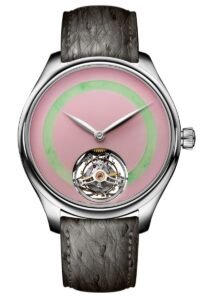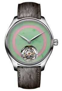 Ref. 1805-1206と1805-1204は、バーミーズジェイド(翡翠)とピンクオパールを組み合わせたダイヤルが特徴です。翡翠の深い緑とオパールの柔らかなピンクが絶妙に調和し、視覚的なインパクトを与えます。ダイヤルにはインデックスやロゴがなく、6時位置に配置されたフライングトゥールビヨンが際立ちます。グレーのオーストリッチレザーストラップが全体のデザインを引き締め、洗練された印象を与えます。