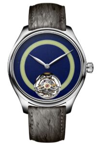 Ref. 1805-1205は、ラピスラズリの深いブルーとレモンクリソプレーズの明るいグリーンを組み合わせたダイヤルが特徴です。この色彩のコントラストは、視覚的な魅力を高めるとともに、時計全体にモダンな雰囲気をもたらします。6時位置のフライングトゥールビヨンがダイヤルの中心的な要素となり、技術と美の融合を象徴しています。グレーのオーストリッチレザーストラップが、ダイヤルの鮮やかな色彩を引き立てます。