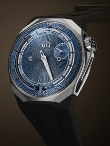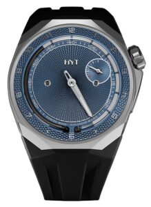 HYTの「T1 チタン ギョーシェ」Ref. H03421-Aは、伝統的なギョーシェ彫りと革新的な流体機械式技術を融合させた、世界限定8本の希少なタイムピースです。