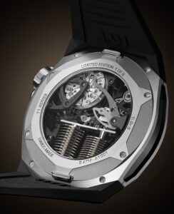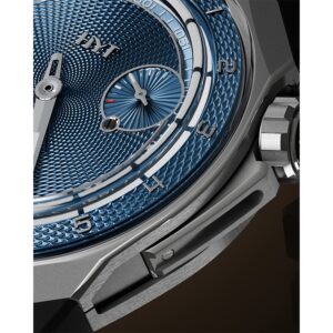 「T1 チタン ギョーシェ」のデザインは、伝統と現代性を融合させたものです。ケースは、シルバーとブラックのDLCコーティングが施されたチタン製で、サテン仕上げが高級感を演出しています。ケース径は45.3mm、厚さは17.2mmで、人間工学に基づいた設計により、腕へのフィット感が向上しています。また、2時位置と3時位置の間に配置されたリューズは、長いリューズガードによって保護され、装着時の快適性が高められています。ストラップは、ブルーのアリゲーターレザーストラップと、ピュアブラックのラバーストラップの2本が付属しており、クイックチェンジシステムにより簡単に交換が可能です。これにより、フォーマルな場面からカジュアルなシーンまで、幅広いスタイルに対応できます。