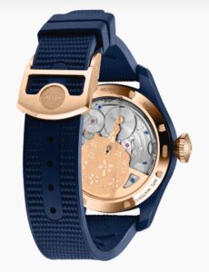 IW504901では、深みのあるブルーセラミックを採用した46.5mmのケースが最大の特徴です。この先進素材は耐傷性に優れ、かつ非常に軽量であり、日常使いにおいても抜群の快適さを提供します。さらに、リューズとケースバックリングには温かみのある18Kレッドゴールドが使用され、ブルーとのコントラストが圧倒的な高級感を演出。IWCの高度な素材技術と美的センスが存分に発揮されたデザインとなっています。