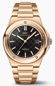 IW328702は、18K 5Nゴールドを全面的に使用したインヂュニアオートマチック40の新作です。ケース、ベゼル、クラウン、クラウンガード、ブレスレットのすべてがゴールドで仕上げられており、ブラックのダイヤルとのコントラストが際立つデザインとなっています。ケースサイズは40mm、厚さ10.4mmで、100mの防水性能を備えています。ムーブメントはIWC自社製キャリバー32111を搭載し、120時間のパワーリザーブを誇ります。