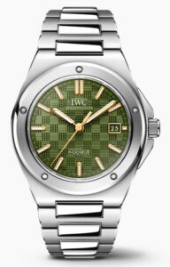 IW328908は、映画『F1』でブラッド・ピット演じるキャラクター、ソニー・ヘイズが着用するカスタマイズされたヴィンテージインヂュニアからインスピレーションを得たモデルです。ステンレススティール製のケースとブレスレットに、グリーンのダイヤルとゴールドプレートのインデックス、針を組み合わせています。ケースサイズは40mm、厚さ10.8mm、100mの防水性能を備え、ムーブメントには120時間のパワーリザーブを持つキャリバー32111を搭載しています。このモデルは1,000本限定での販売となります。