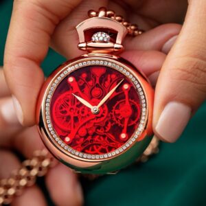 このモデルは、ケース径約42.5mmの18Kローズゴールド製ペンダントウォッチ。スケルトン構造でムーブメントが見え、内周に配置された約103粒のダイヤモンドによって際立つ豪華さを演出しています。限定101本のプレミアムモデルで、リファレンスから“BS200.40.RD.QR.A”と明記されています。価格は約10万7000ドルと報じられています。