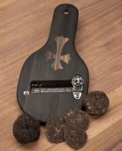もうひとつの注目アイテムが、クロムハーツ製のトリュフスライサーです。こちらはシルバー製の刃と、ダークウッドのハンドル部分が美しく融合した一品。滑らかな木目と冷たい金属のコントラストが美しく、まるで高級カトラリーのような趣を漂わせています。