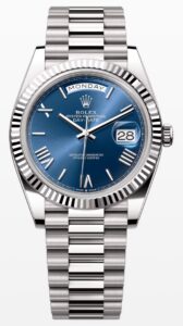 ホワイトゴールドケースにブルーベゼルを組み合わせたモデル。プラチナならではの輝きを持ちつつ、高い耐久性を誇ります