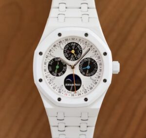 エド・シーランは、オーデマ ピゲのロイヤル オーク パーペチュアルカレンダーのホワイトセラミックモデルも所有しています。この時計は、ホワイトセラミック製のケースとブレスレットが特徴で、耐傷性と軽量性を兼ね備えています。さらに、パーペチュアルカレンダー機能を搭載しており、日付や曜日、月、ムーンフェイズを自動的に調整します。エドのモデルは特別仕様で、文字盤のサブダイヤルがブラックで統一された「パンダダイヤル」となっており、彼の音楽キャリアを象徴するカラフルな要素が取り入れられています。