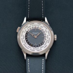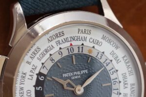 エド・シーランは、世界中をツアーで巡るライフスタイルにぴったりなパテック フィリップの「5230G ワールドタイム」を愛用しています。このモデルは、ホワイトゴールド製のケースと、美しく仕上げられたブルーのギヨシェ装飾の文字盤が特徴で、通常「ロンドン」と表記される都市名をエド・シーランの故郷「フラムリンガム」に変更した特別仕様です。
