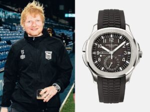 エド・シーランのコレクションの中でも、特に注目されるのがパテック フィリップのアクアノート「Ref.5164A-001」です。このモデルは、ステンレススチール製のケースとブラックのラバーストラップが特徴で、スポーティーさとエレガンスさを兼ね備えています。特に、トラベルタイム機能を搭載しており、2つのタイムゾーンを同時に表示できるため、世界を飛び回るアーティストにとって非常に実用的です。エドは地元サッカークラブの試合観戦時にもこの時計を着用しており、そのカジュアルなスタイルにもマッチしています。