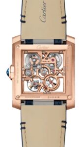 このモデルには、ブルーのアリゲーターレザーストラップが組み合わされており、ピンクゴールドのケースとのコントラストが美しい仕上がりです。また、ムーブメントの仕上げやダイアルのデザインにも細部までこだわりが見られ、カルティエの高いクラフツマンシップが感じられます。