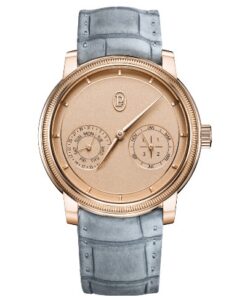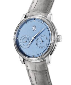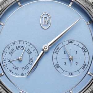 プラチナモデル(Ref:PFH952-2010002-300181)のダイヤルは「モーニングブルー」と呼ばれる手作業で仕上げられたグレイン加工が施されています。一方、ローズゴールドモデル(Ref:PFH952-2010001-300181)のダイヤルは「ゴールデンアワー」と名付けられ、同様の手作業による仕上げが特徴です。どちらのモデルも、18Kゴールドのアプライドインデックスとアルファ型の時・分針を備え、上品な印象を与えます。