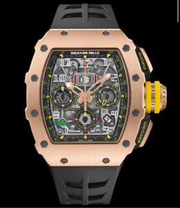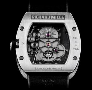 リシャール・ミルが2001年に発表した最初のモデル「RM 001 トゥールビヨン」は、ブランドの哲学を象徴する一本でした。 カーボンナノファイバー製のベースプレートやスケルトンデザインを採用し、軽量かつ耐久性に優れた構造を実現しました。このモデルが、高級時計の未来を変える第一歩となりました。