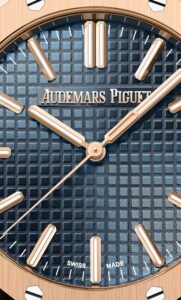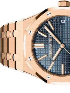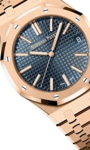 このモデルは、41mmサイズのロイヤルオークに18Kピンクゴールドケースを組み合わせたラグジュアリーな一本です。最大の特徴は、ダイヤルに採用された深みのあるブルー。オーデマ・ピゲの伝統的な「グランド・タペストリー」模様が、青の背景に映えることで非常にエレガントな印象を与えます。針やインデックスにもピンクゴールドが使われており、ダイヤル全体としての統一感も抜群です。ビジネスシーンからフォーマルな場面まで対応できる万能なデザインでありながら、華やかさも兼ね備えています。
