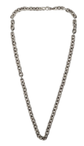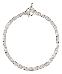 エルメスの「シェーヌダンクル」は、1938年にデザインされた歴史あるアイテムで、「錨の鎖」から着想を得た構造でタイムレスなデザインが特徴です。ジュエリーでありながら彫刻作品のような佇まいは、シンプルながら高級感を放ち、男性の首元を力強く、洗練された印象に演出します。