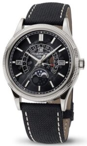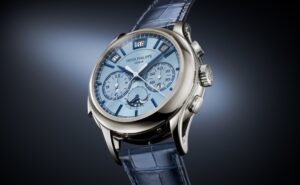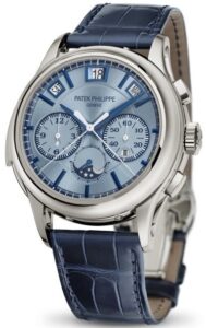 このモデルは、アイスブルーのソレイユダイアルを採用し、深いブルーのアワーマーカーと時分針が配置されています。6時位置にはスモールセコンドとムーンフェイズ、12時位置には12時間積算計と60分積算計が配置され、視認性と美観を両立しています。ケースは全面ポリッシュ仕上げの18Kホワイトゴールド製で、ブリリアントネイビーブルーのアリゲーターバンドが組み合わされています。