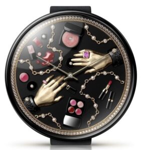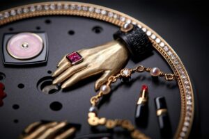 • モチーフと構造:リップスティックやアイシャドウパレット、ネイルポリッシュ、チーク、パールのジュエリーなどを、エナメルやグランフー細密画、彫金で表現