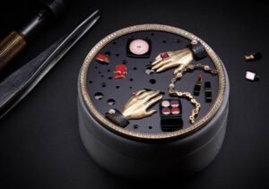 「マドモアゼル プリヴェ ピンクッション ビューティー アート」は通常のピンクッション モチーフを超え、シャネルの“Beauty”ライン(リップやチーク、ジェル ラッカーなど)を詰め込んだ、まるでドレッサーを縮小したかのようなダイヤルが特徴です。ガブリエル・シャネルの手元に着想を得たこの作品は、ウォッチ&ワンダーズ ジュネーブ 2025で世界限定1点として発表されました。
