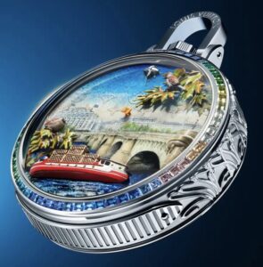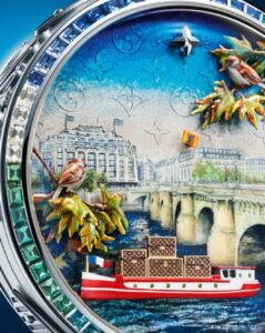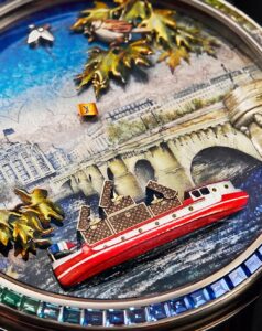 パリ最古の橋ポンヌフを舞台にしたこの作品は、右岸にそびえるルイ・ヴィトン本社とサマリテーヌ百貨店、セーヌ川を行くバージに載るトランクなど、秋の情景を手作業でエナメルと彫金によって精緻に描写しています。7種類13パーツのアニメーションにより、動きのある詩的世界を生み出しています 。
