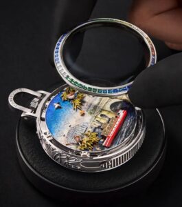 18Kホワイトゴールドケースにはアールヌーボー装飾を施し、ダイヤとカラーサファイヤなど60石(総3.85ct)をベゼルにセット。エナメルには30色、30回の焼成を要し、小動物から建物までミニマルに再現されています 。