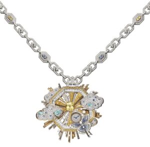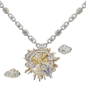 ブルガリの「ポリクロマ ヌヴォレ プレツィオーゼ」は、2025年に発表された高級ペンダントウォッチです。この時計は、ジュエリーと時計の境界を超えたデザインで、取り外し可能な雲のモチーフがイヤリングとしても使用できるなど、多機能性を備えています。また、中央には6.88カラットのイエローサファイアが輝き、見る者を魅了します。
