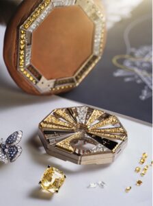 これらの宝石は、ホワイトゴールドとイエローゴールドのケースに美しくセットされ、全体で1,560時間以上の製作時間を要しています。