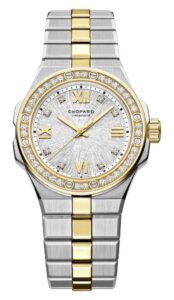 ショパール初となる、ルーセントスティール™と18Kエシカルイエローゴールドのバイカラー仕様。ケース本体およびブレスレットリンクはルーセントスティール™、ベゼル・リューズ・ブレスレット中央コマはイエローゴールドで構成されています。高度な耐久性とエレガントな輝きを兼ね備えた仕上がりです。