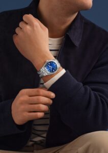 同じく41mmのステンレススチールケースを持ち、こちらはシンプルな時・分・秒+日付表示のみを備えた自動巻きモデルです。ブルーの文字盤は控えめでエレガントな印象を与え、日常使いからフォーマルな場面まで幅広く対応します。防水性能は150m、デザインのミニマルさゆえ、時計本来の美しさを際立たせる一本です。